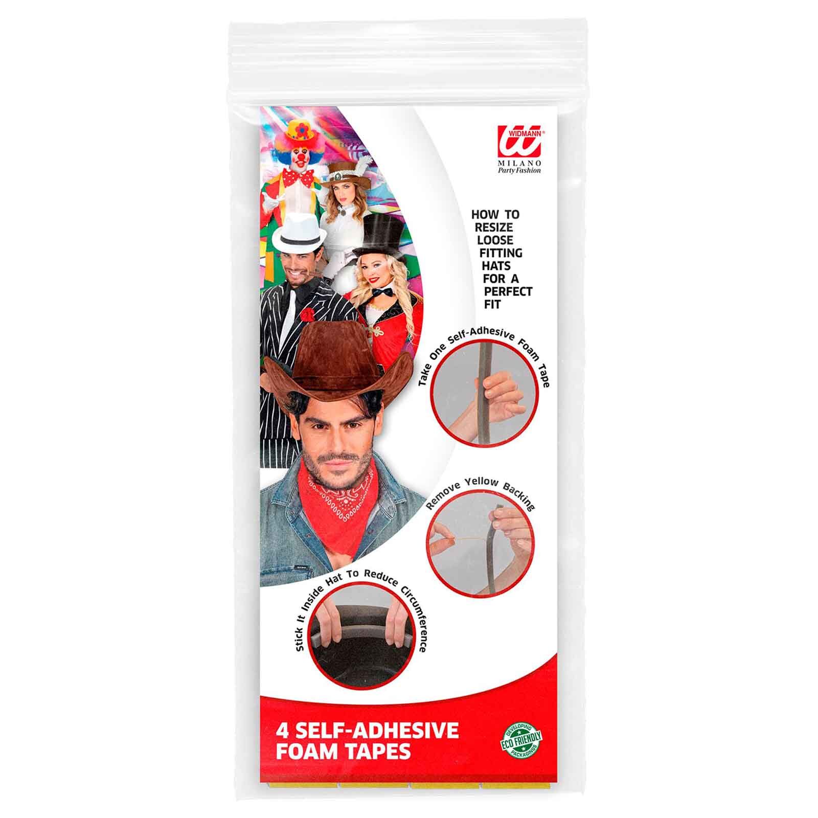 These self-adhesive foam tapes are your life-saver accessory when your hat is a little too roomy. The pack includes 4 black soft foam strips which stick to the inside of your hat to help with movement when a slight adjustment or resize is needed for a comfortable fit. Perfect for costume hats or any hats that have a hard base.