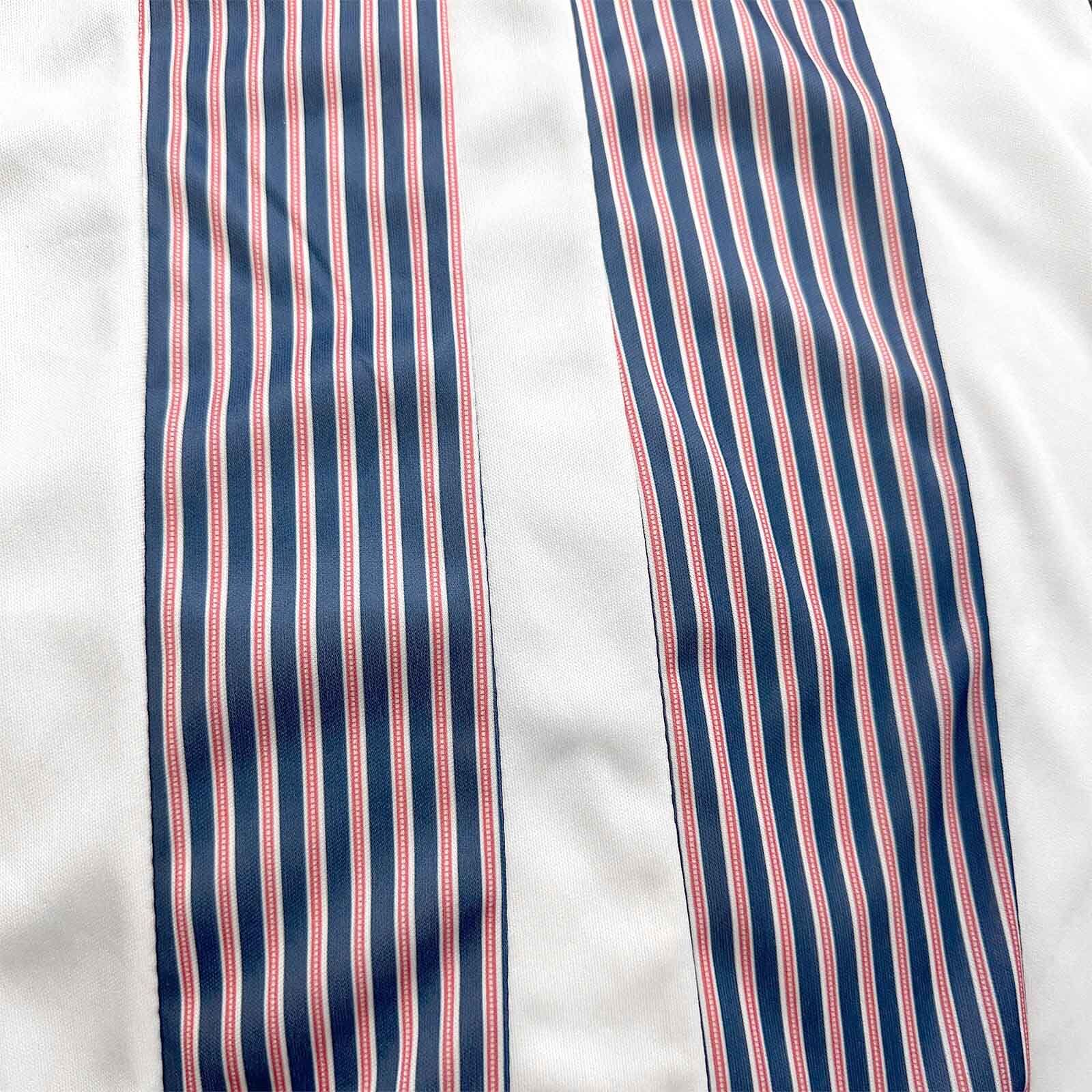 - Feature strips of striped fabric are sewn down the centre front in navy, red and white stripes