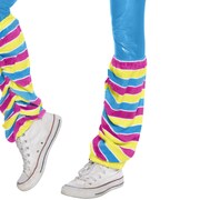 - Stripe legwarmers made from lightweight terry type fabric with elastic top and bottom (yellow, blue, pink, white); elastic runs up the side to give the gathered look