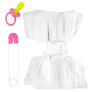 - Adult-size disposable nappy in white with a fun printed front and sticky tabs for easy wear