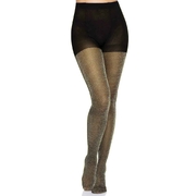 Add some glitz and glamour to your next party outfit (or a bit of fun everyday) with these lurex thread shimmer tights. With a base of black opaque nylon, the tights have a gold thread throughout. The top of the tights is opaque black as pictured. Made from 69% nylon, 23% metallic, and 8% spandex.
