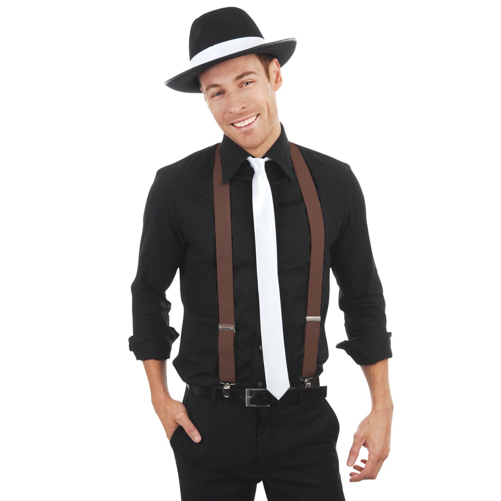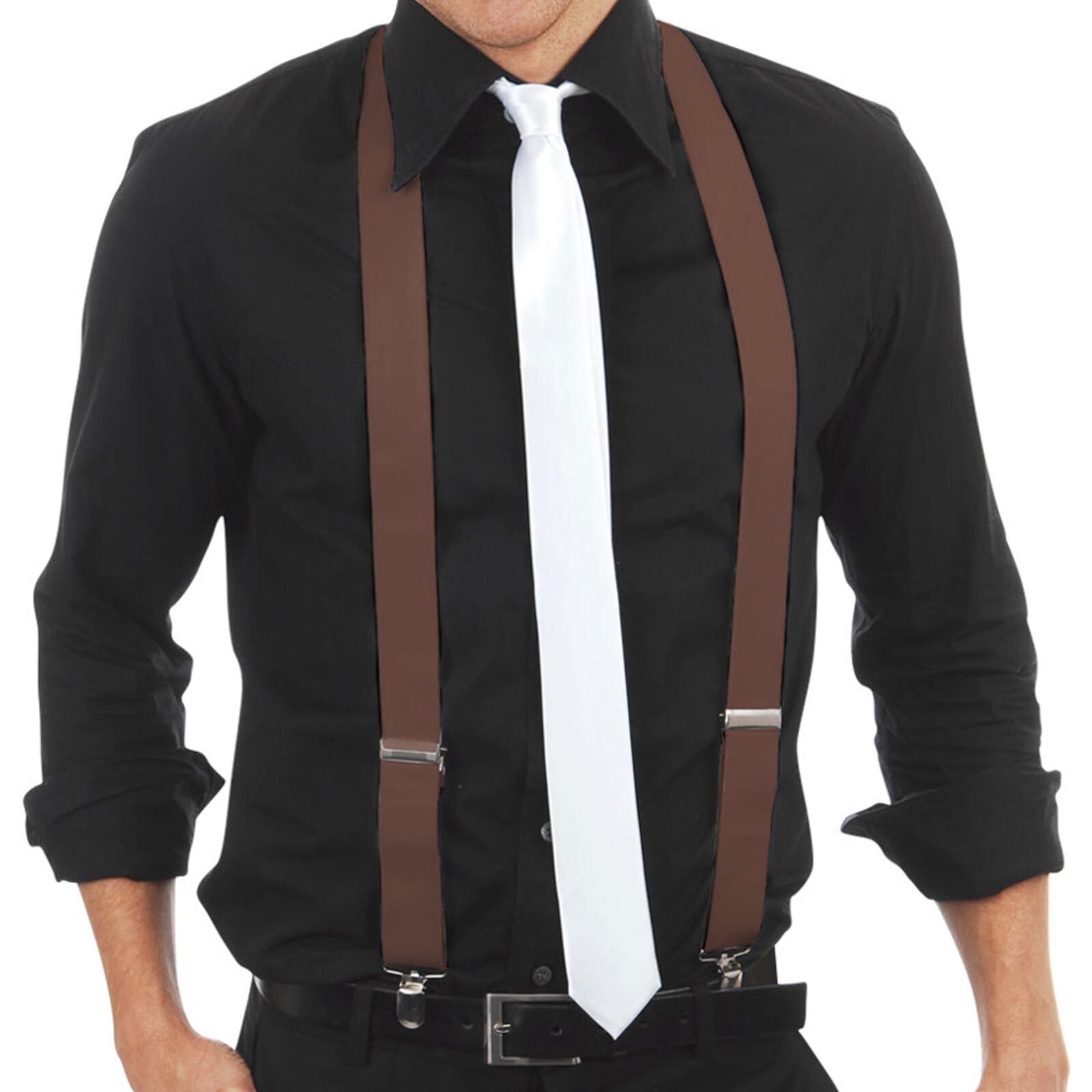 Add to your 1920s Gangster costume, Oktoberfest look or formal outfit with these brown clip on suspenders/braces. Also great for the office ... especially with a bow tie! Made from full stretch elastic, these braces are fully adjustable. Elastic is 3.5cm wide.