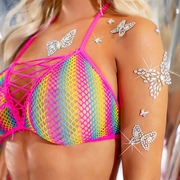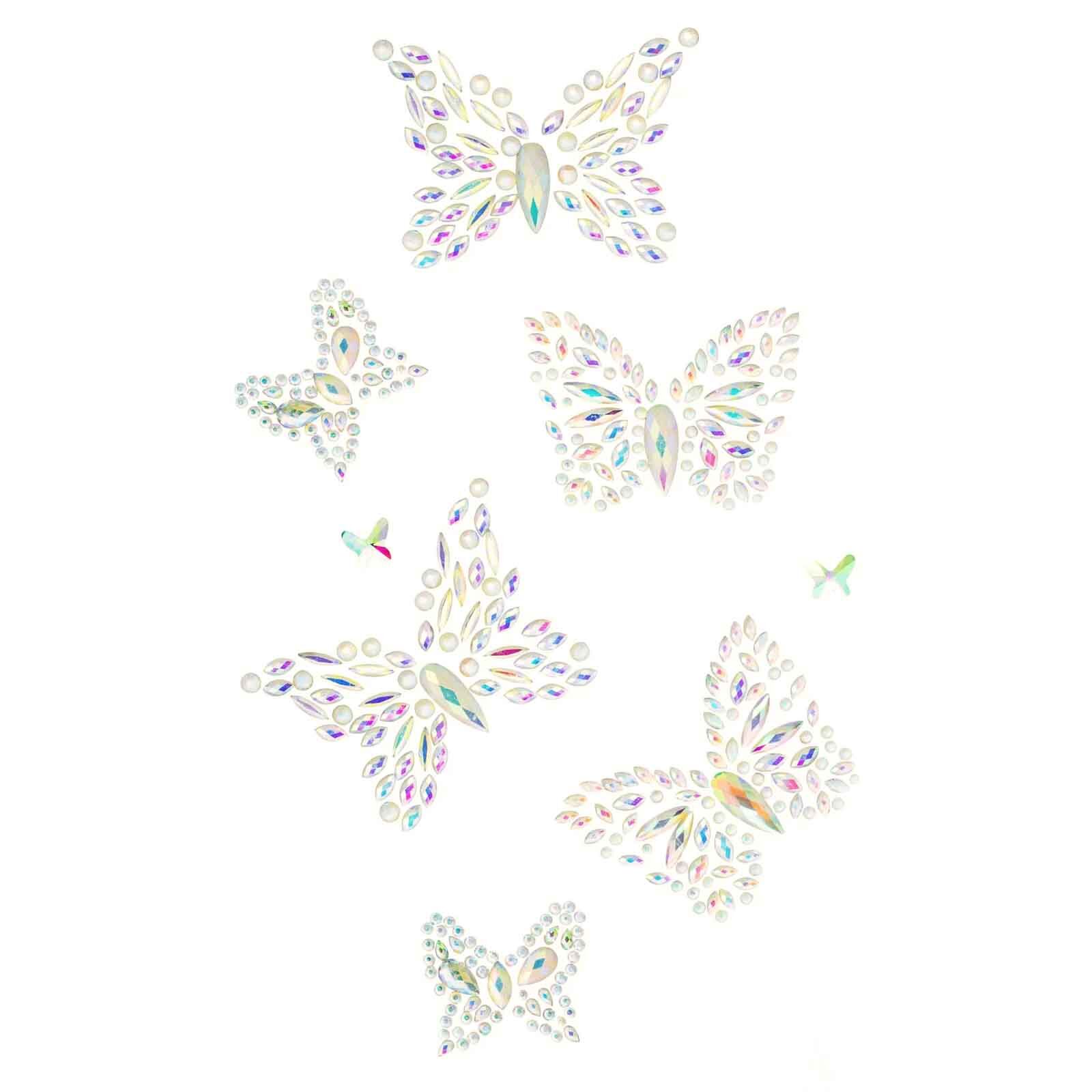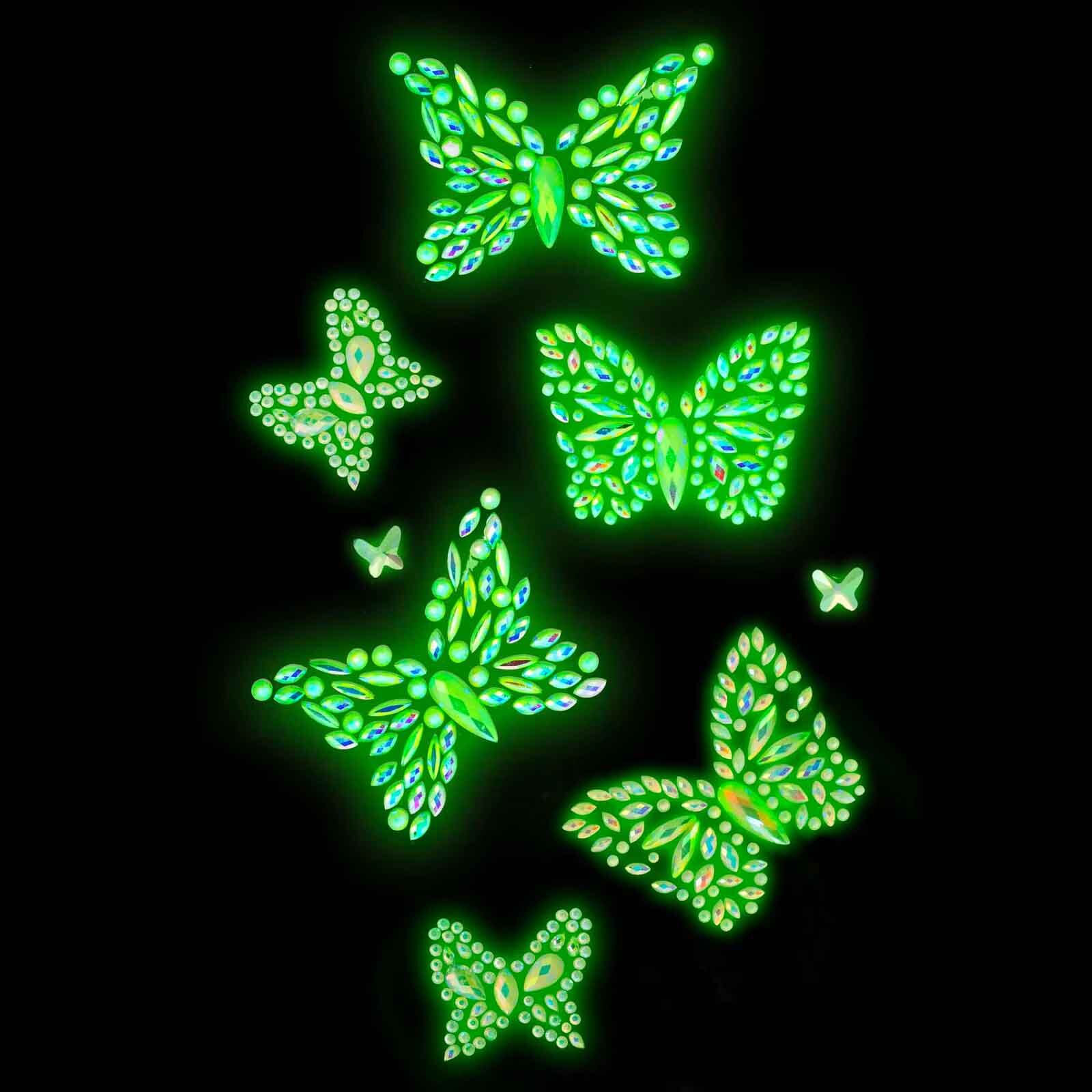 Add an otherworldly shimmer to your look with these ethereal glow in the dark butterfly body jewels, the perfect accessory for creating a magical and luminous costume. Featuring delicate butterfly designs in various sizes that softly glow in low light. In full light the gems are AB clear picking up different colours.