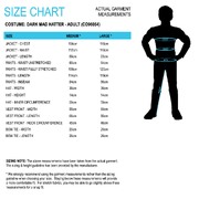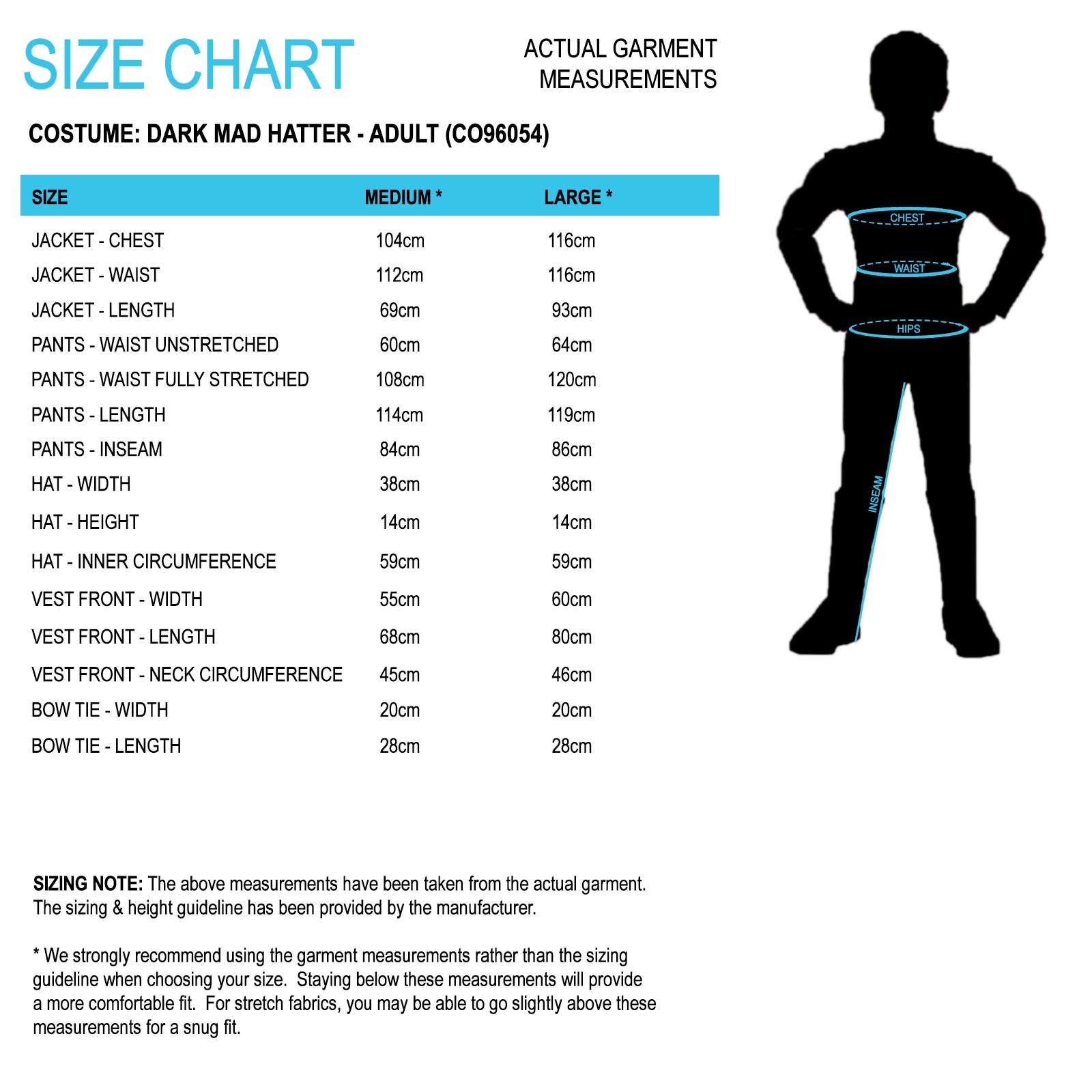 These measurements have been taken from the actual garments without stretching the fabric unless noted otherwise. For this costume, we suggest being quite a bit under these measurements for a comfortable, looser fit. We note that length of the jacket, in particular, in the large size is quite generous. The jacket will fit larger waist and chest sizes due to the jacket not having any closure.