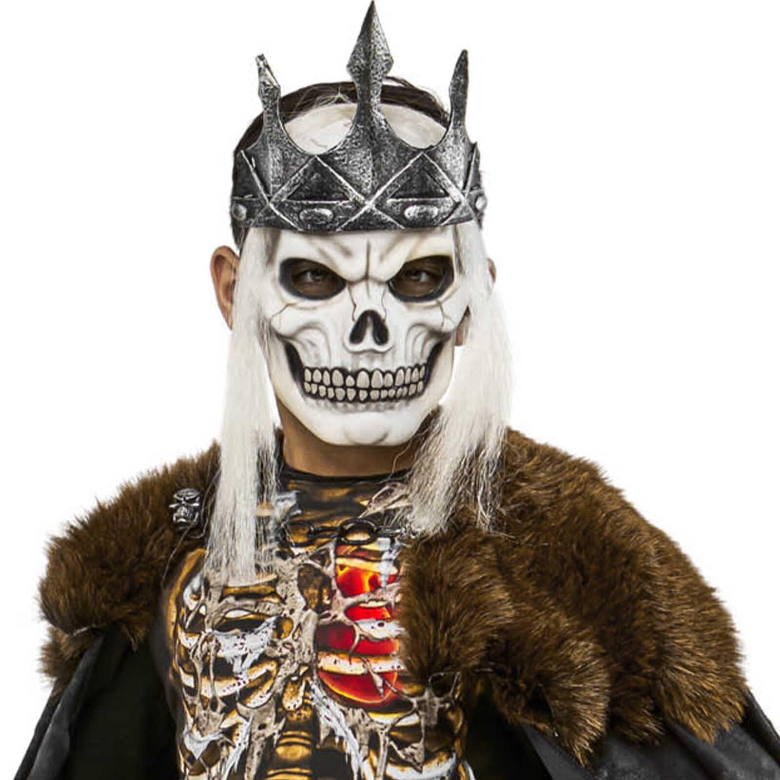 - White plastic skull face mask with black painted details, attached white hair strands and topped with a latex crown painted in black and silver (elastic is included to hold the mask to the head)