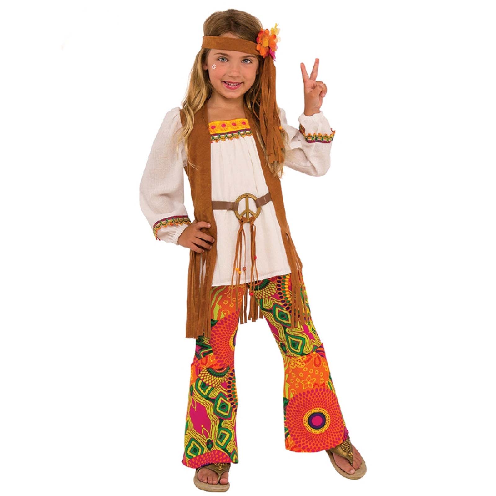 Your child will love dressing up in this flower child hippie costume. Perfect for a 1960s/70s theme party. The costume set includes a pair of bellbottom pants in a colourful flower power print stretch fabric, top with attached vest, belt, headband & flower clip. We note that the white section of the top is attached to the vest. The white fabric is quite see through (like cheesecloth) with some braided details at the front neckline & sleeves. The belt consists of a strip of lightweight vinyl fabric that sits at the front with a peace symbol & goes through open loops at the sides of the top to allow it to be tied at the back waist. The vest is unedged. This costume has all your need for an awesome look. We feel that the set is a budget quality due to the unfinished edges on the top and quality of the fabric in the top, belt & headband. Great value for money for one wear.