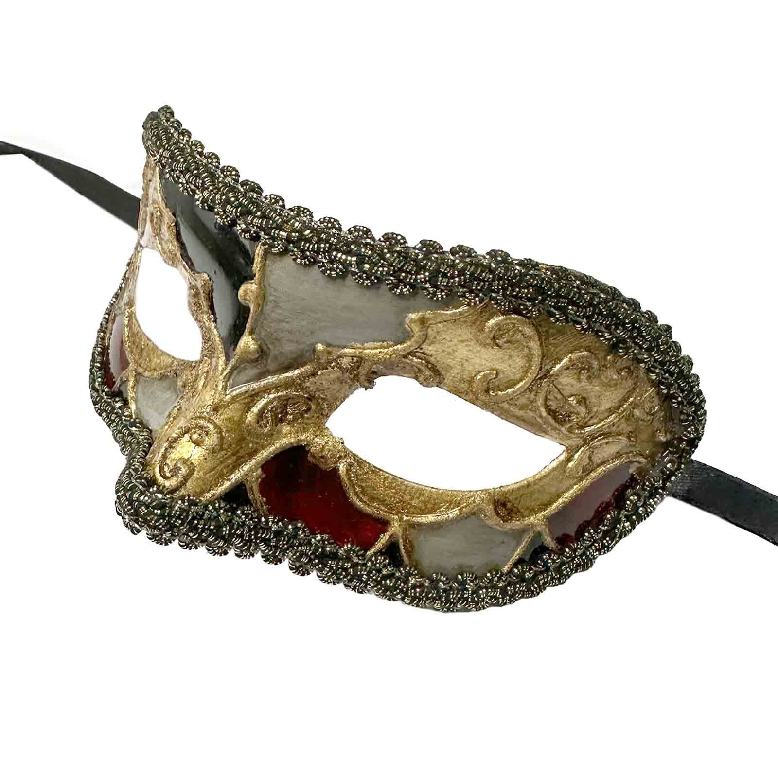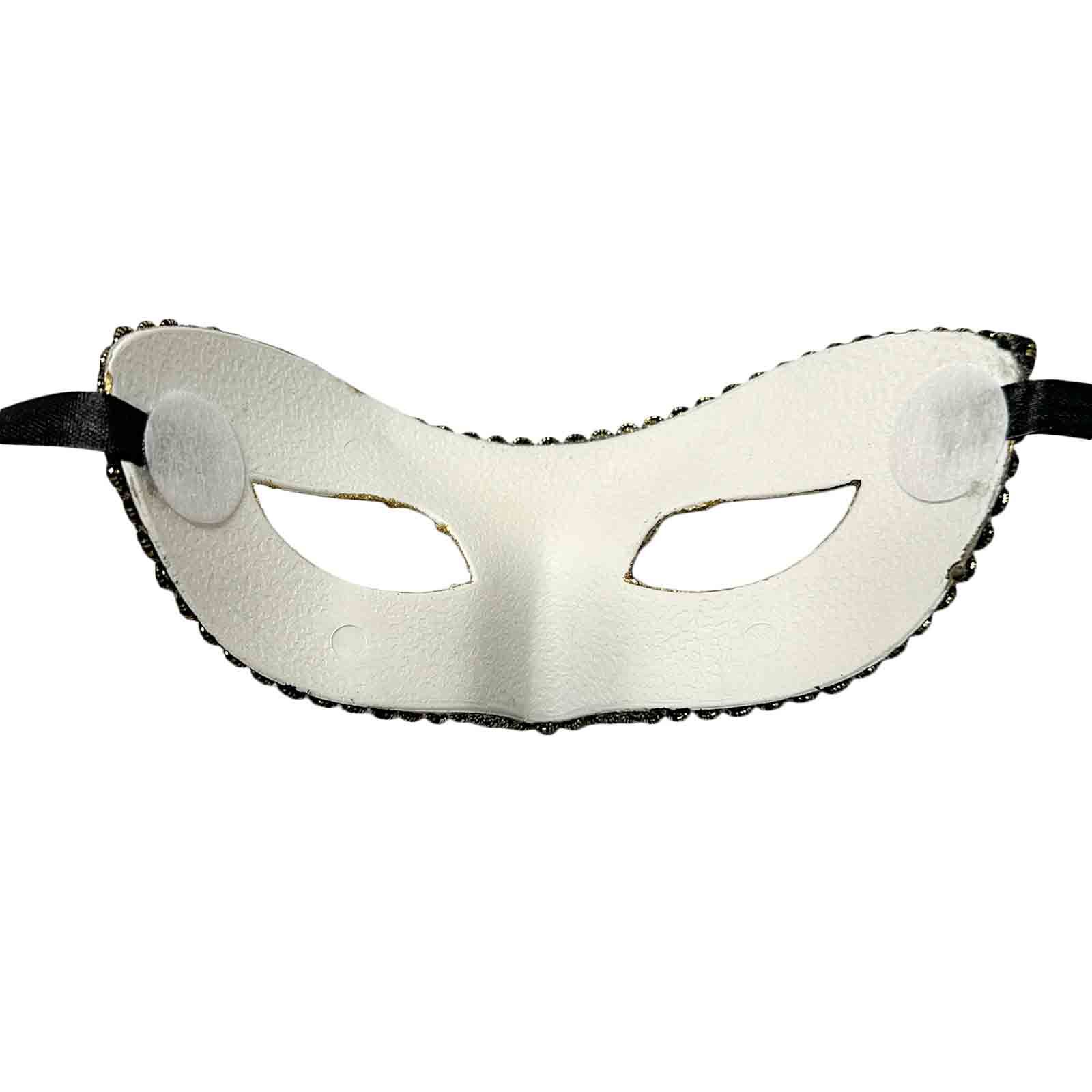 - Gold and black foil braided trim is glued around the edge of the mask