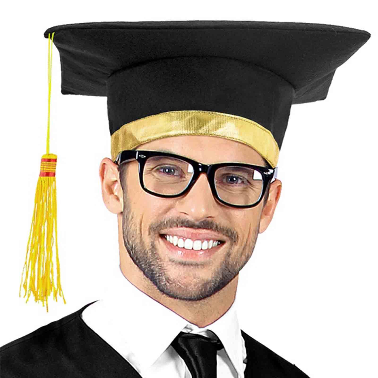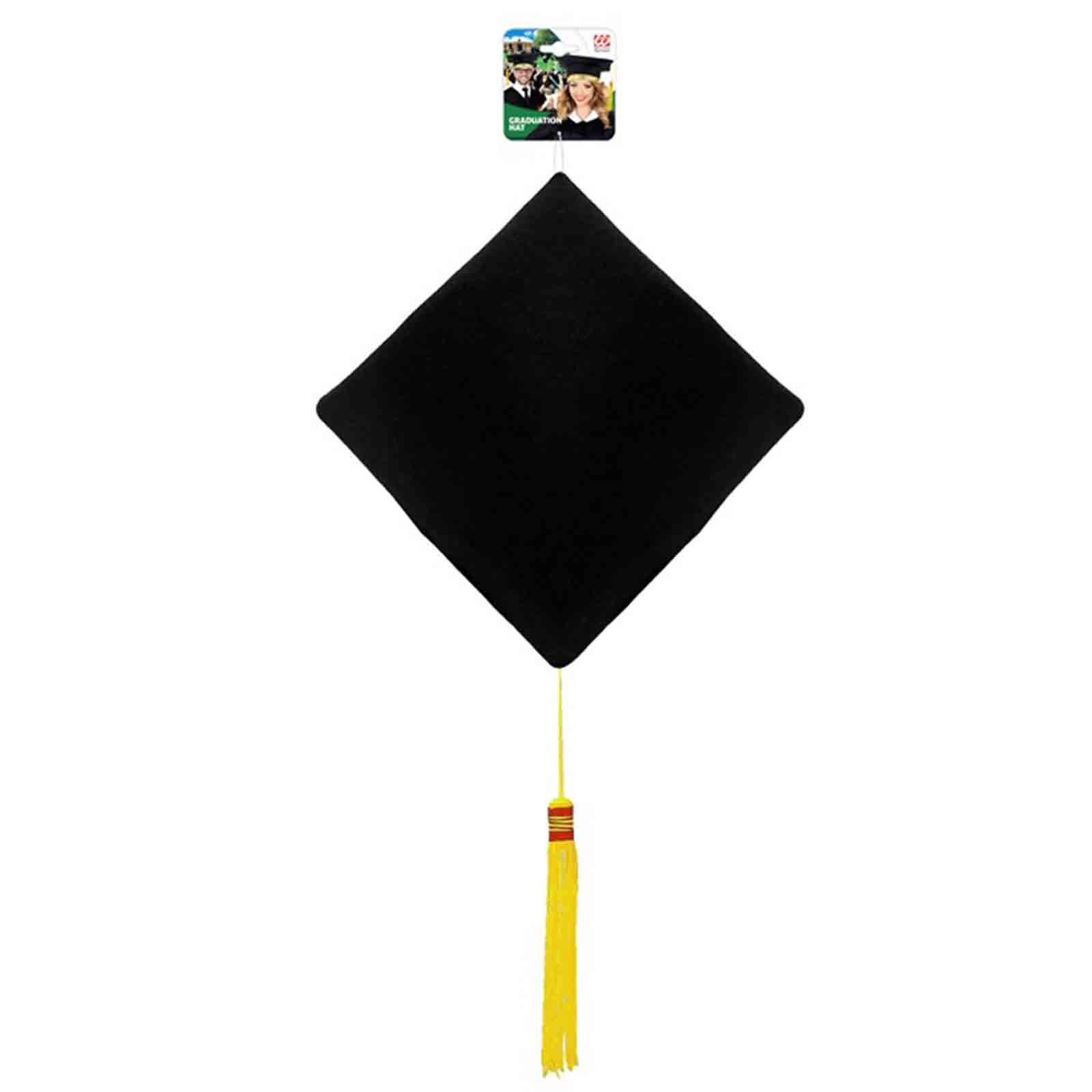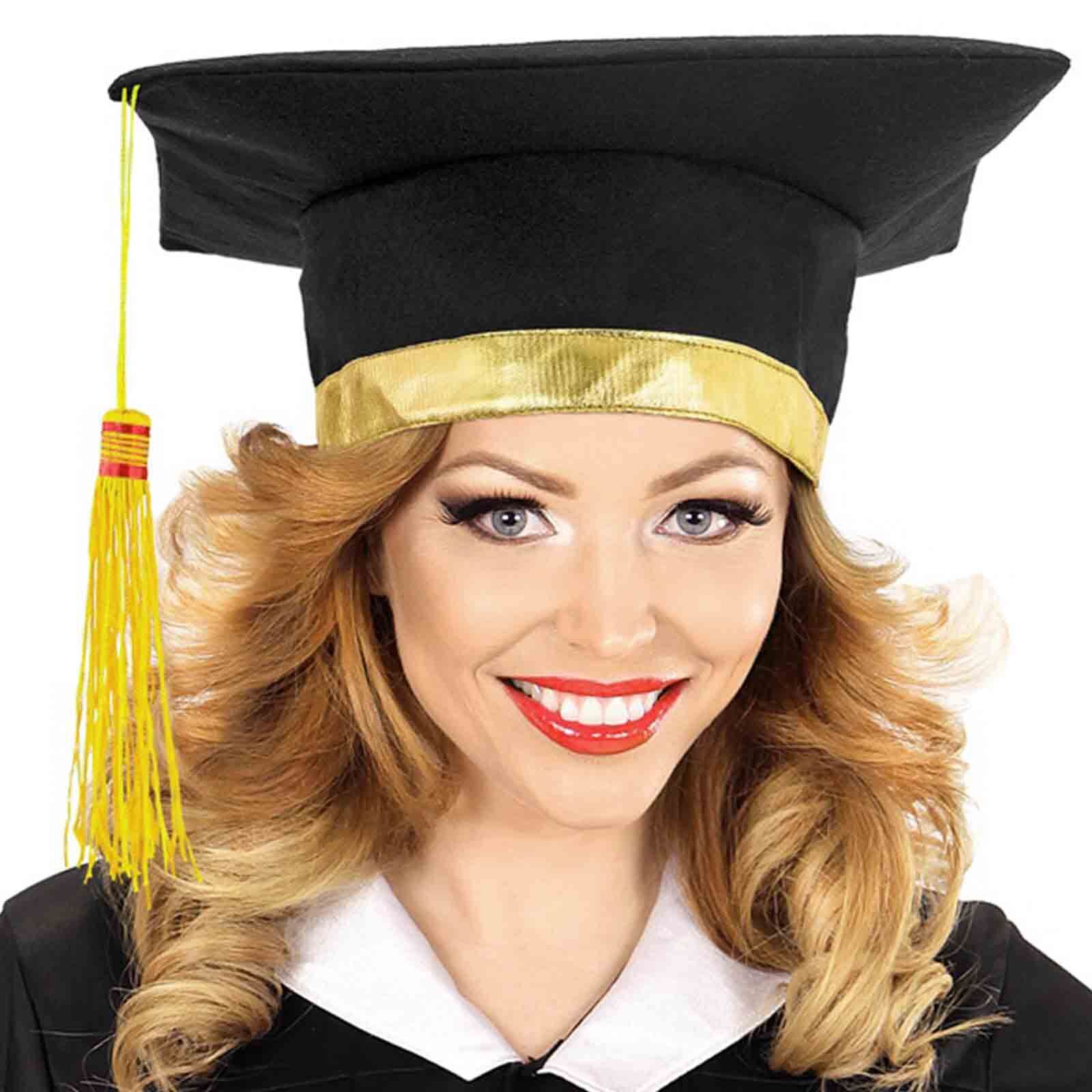 This classic black hat is the perfect finishing touch for your Graduation costume, whether it's for a costume party or a fun dress up to celebrate. This soft version of a mortar board hat has gold edging and a yellow tassel, is lightweight and portable if you are travelling for the event. Add a graduation robe to complete the look.