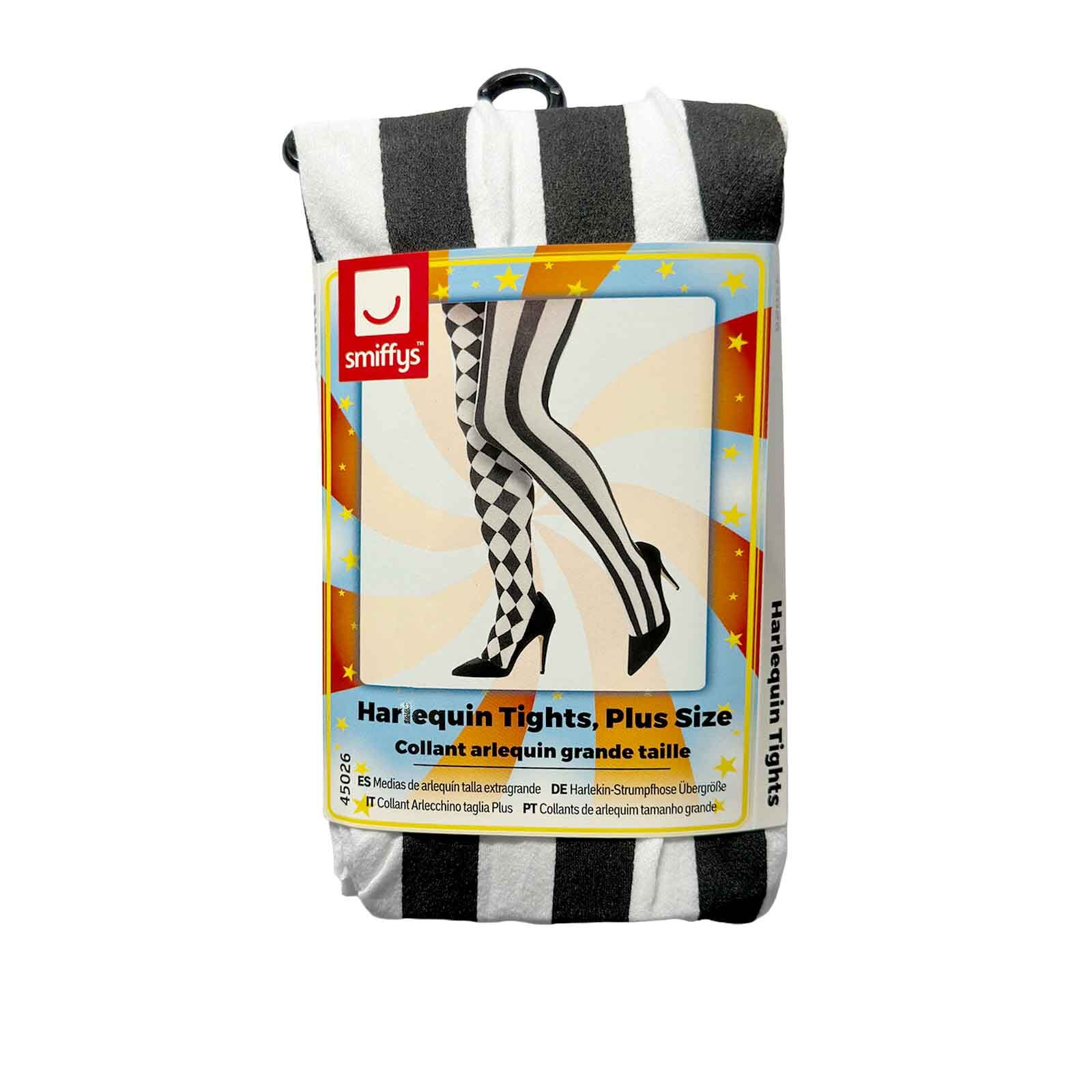 These Harlequin costume tights would be perfect to complete a harlequin clown costume, Harley Quinn inspired outfit, Mardi Gras theme, circus performer look or Alice in Wonderland character for your next costume party or event. One leg is printed in black and white diamonds and the other leg is black and white stripes. These tights are made from 100% nylon with a 75 denier.