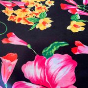 - Sleeveless dress made from lightweight stretch fabric with bright pink and yellow flower print on black background