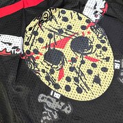 - Black polyester mesh jersey with the iconic Jason mask and knives printed on the front in vinyl print