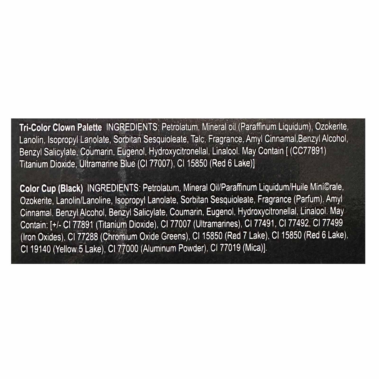 Tri-Color Clown Palette INGREDIENTS: Petrolatum, Mineral oil (Paraffinum Liquidum), Ozokerite, Lanolin, Isopropyl Lanolate, Sorbitan Sesquioleate, Talc, Fragrance, Amyl Cinnamal,Benzyl Alcohol, Benzyl Salicylate, Coumarin, Eugenol, Hydroxycitronellal, Linalool. May Contain [ (CC77891) Titanium Dioxide, Ultramarine Blue (CI 77007), CI 15850 (Red 6 Lake)]