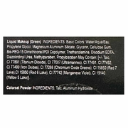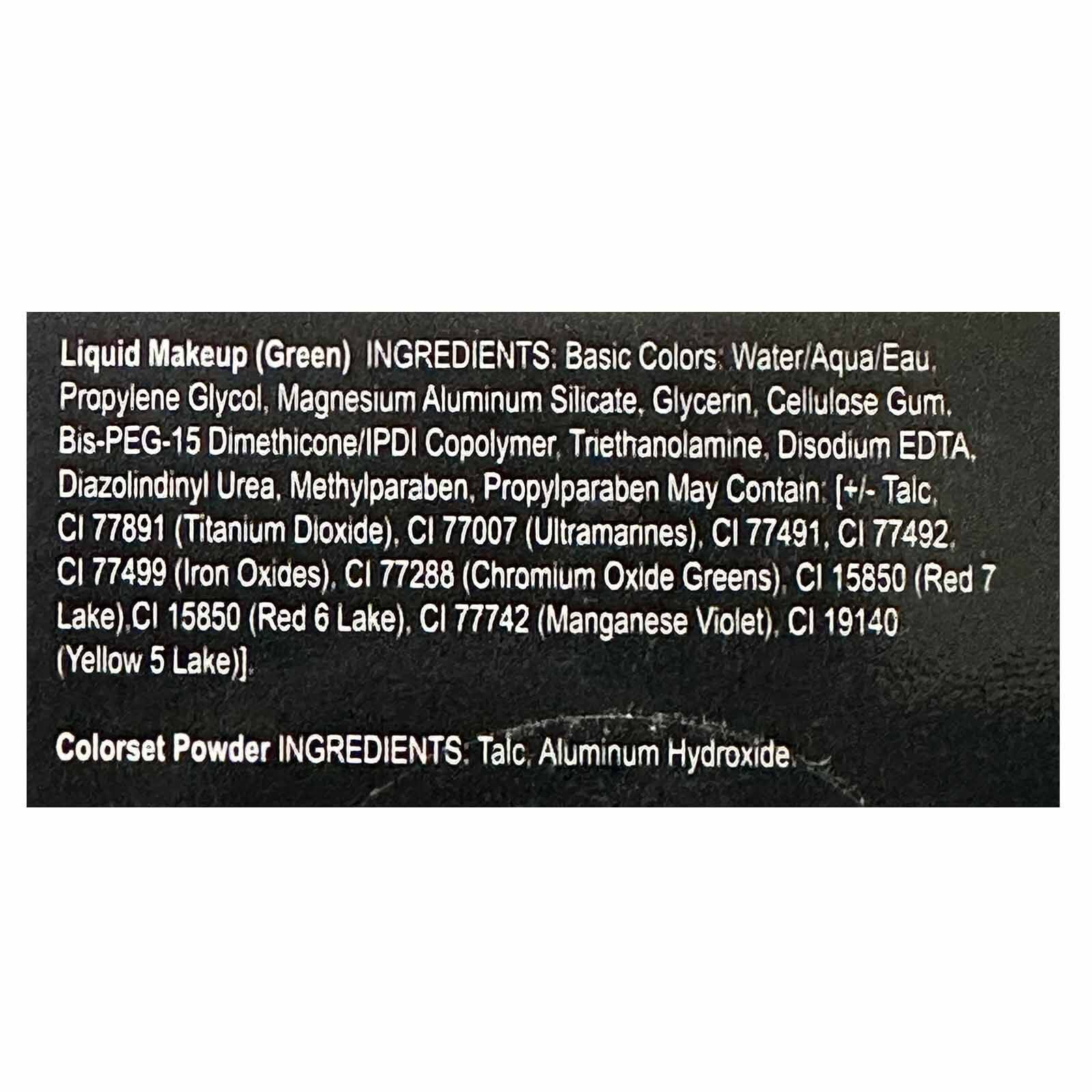 Liquid Makeup (Green) INGREDIENTS: Basic Colors: Water/Aqua/Eau, Propylene Glycol, Magnesium Aluminum Silicate, Glycerin, Cellulose Gum, Bis-PEG-15 Dimethicone/IPDI Copolymer, Sodium Hydroxide, Citric Acid, Disodium EDTA, Diazolindinyl Urea, Methylparaben, Propylparaben May Contain: [+/- Talc, CI 77891 (Titanium Dioxide), CI 77007 (Ultramarines), CI 77491, CI 77492, CI 77499 (Iron Oxides), CI 77288 (Chromium Oxide Greens), CI 15850 (Red 7 Lake),CI 15850 (Red 6 Lake), CI 77742 (Manganese Violet), CI 19140 (Yellow 5 Lake)].