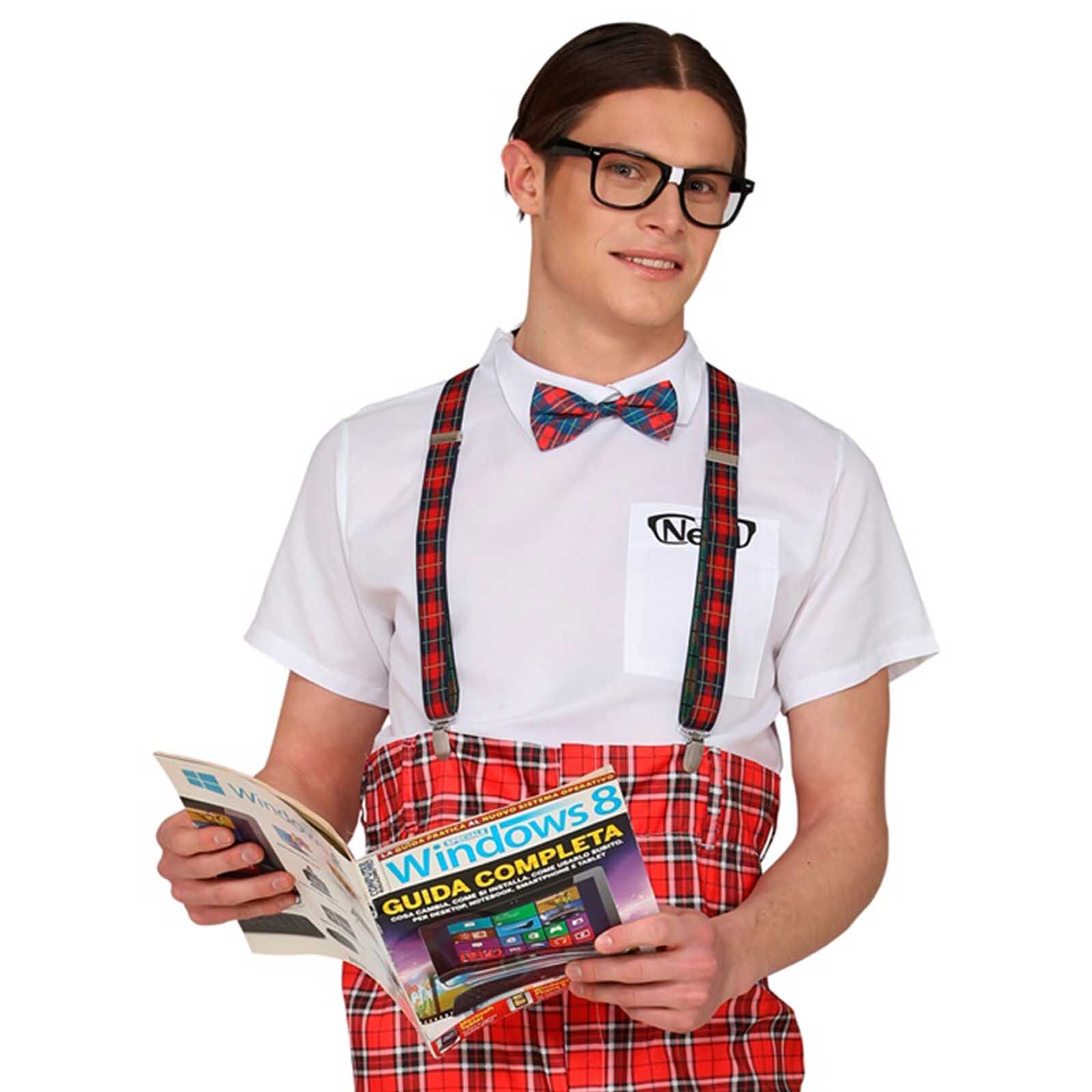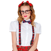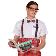 Turn up the awkward charm with this Nerd Accessories Set for adults. Packed with essentials for instant geek chic, this set includes black rimmed glasses, tartan print bow tie and tartan stretch braces. Add your own shirt and high waisted pants to complete your dork-tastic look. These are the perfect accessories to transform into a lovable school nerd, science fair superstar, retro brainiac or an endearing awkward movie sidekick for your next Book Week or movie themed fancy dress party.