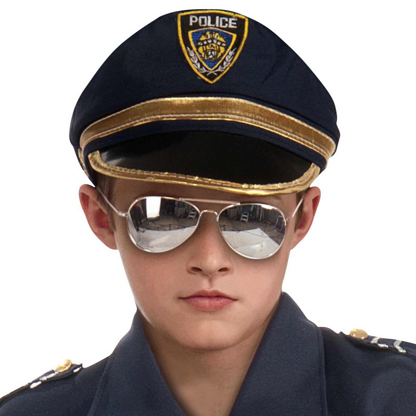 - Fabric navy hat with high peak; printed police emblem and gold trim
