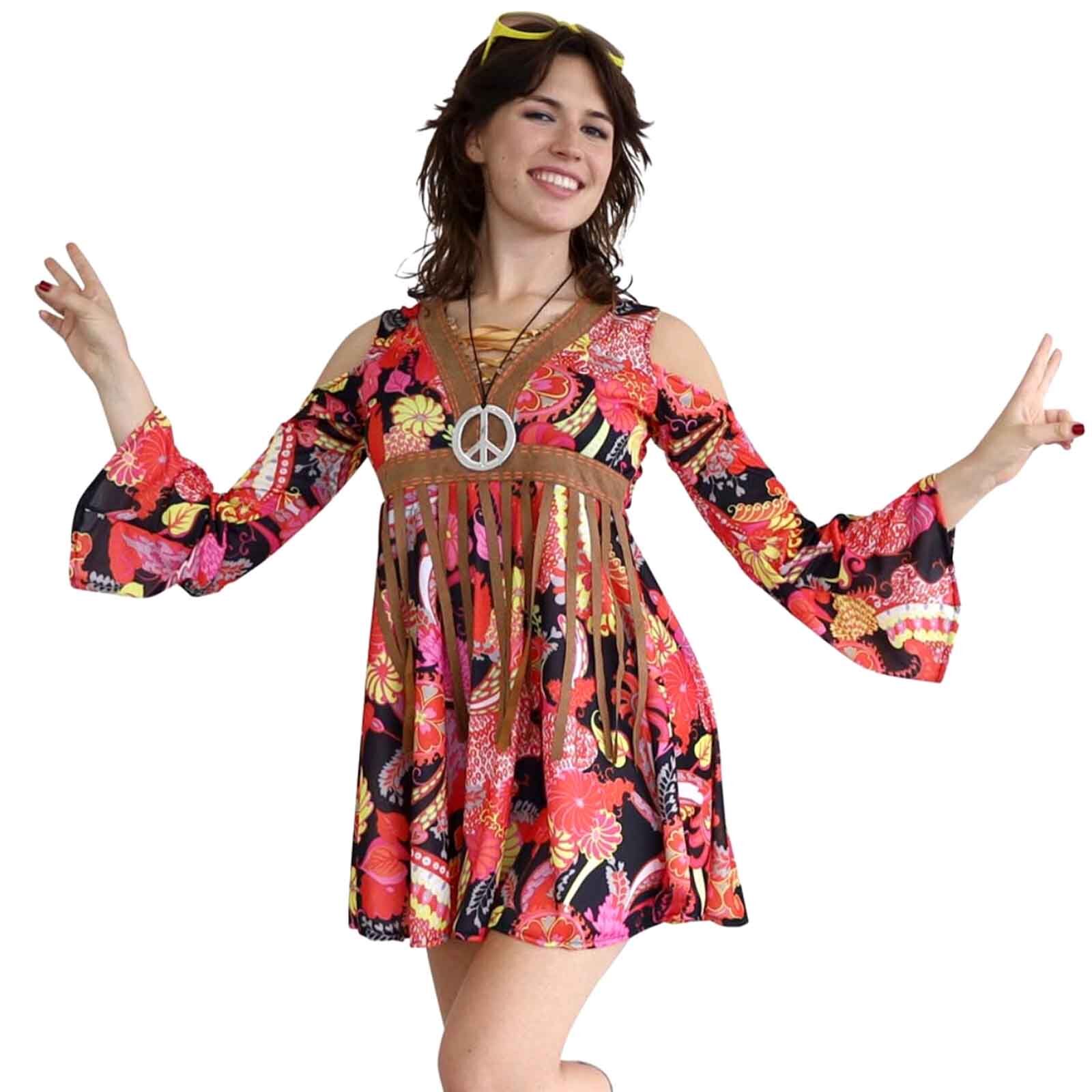 Far out, flower child! The Retro Hippie Chick costume is ready to spread peace, love, and good vibes wherever you go. This fab women’s costume includes a funky cold-shoulder fringe dress with red, pink and yellow flower print on a black background.