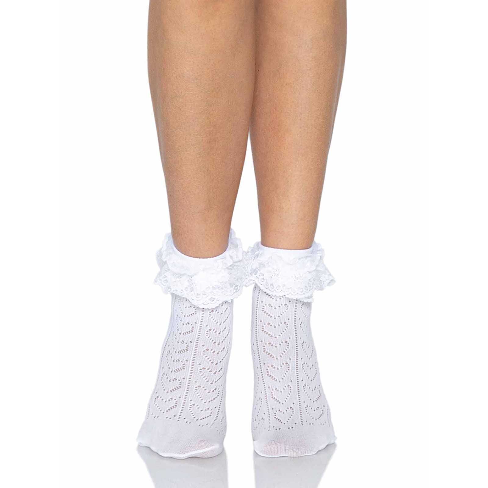 These sweet white lace anklet socks would be perfect to complement a 1950s, school girl or Rockabilly costume. The 'socks' are made from 97% nylon and 3% spandex with a similar thickness to opaque pantyhose (as opposed to sports style socks). There is a delicate heart pattern to the main section of the sock with a lace ruffle on the top.